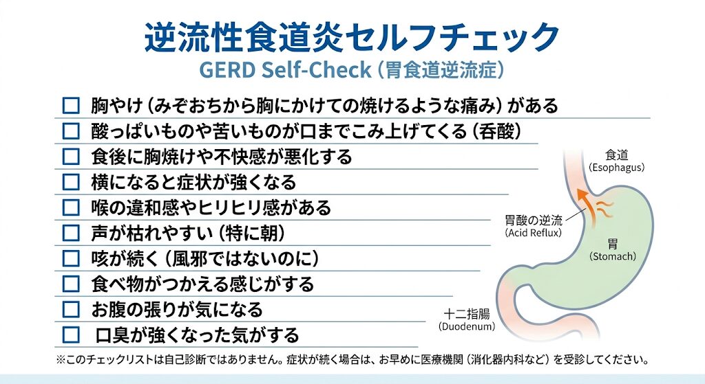 また、慢性的な咳・声のかすれ・睡眠障害など、胸焼け以外の症状で生活の質を大きく下げることもあります。